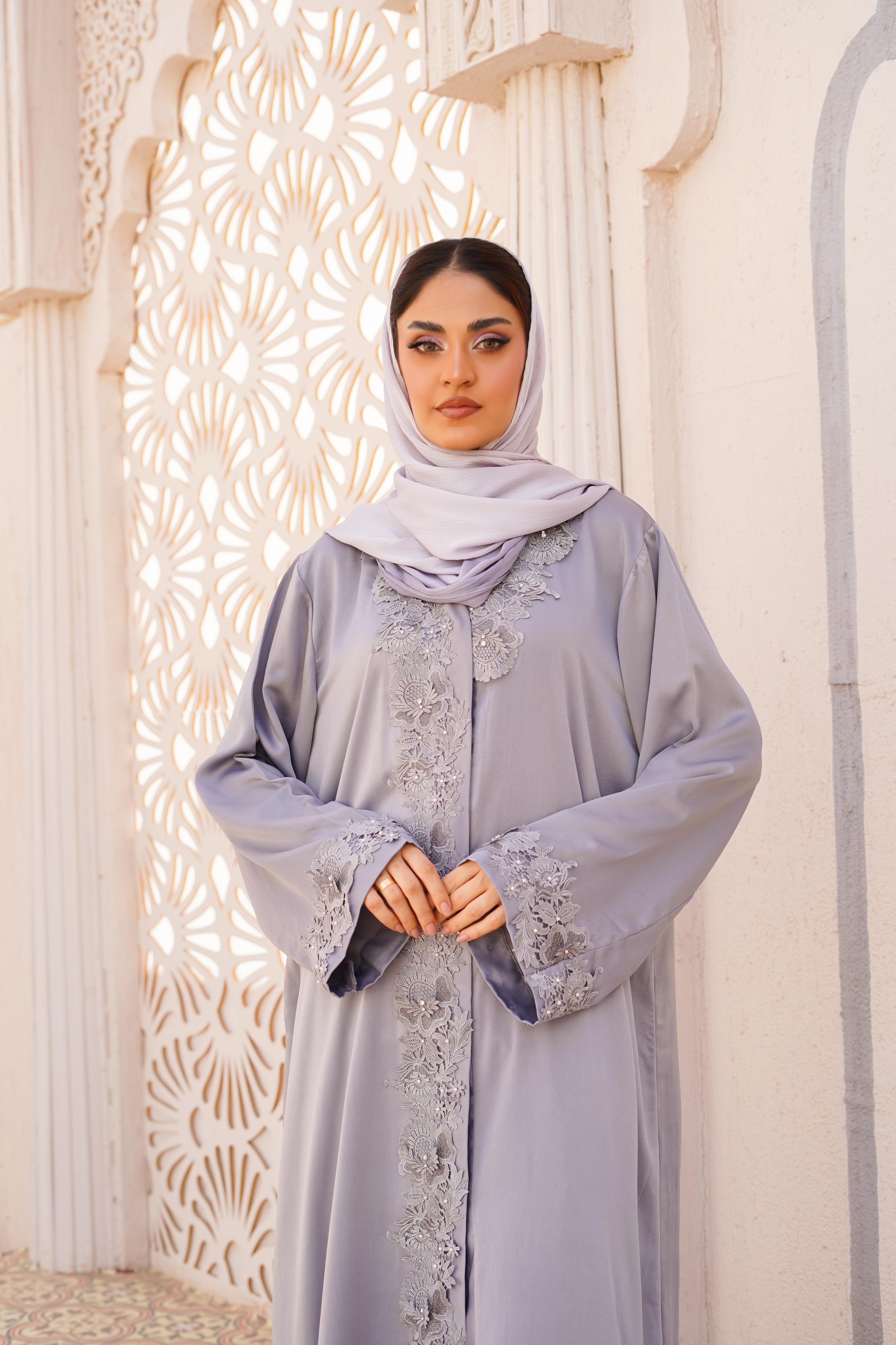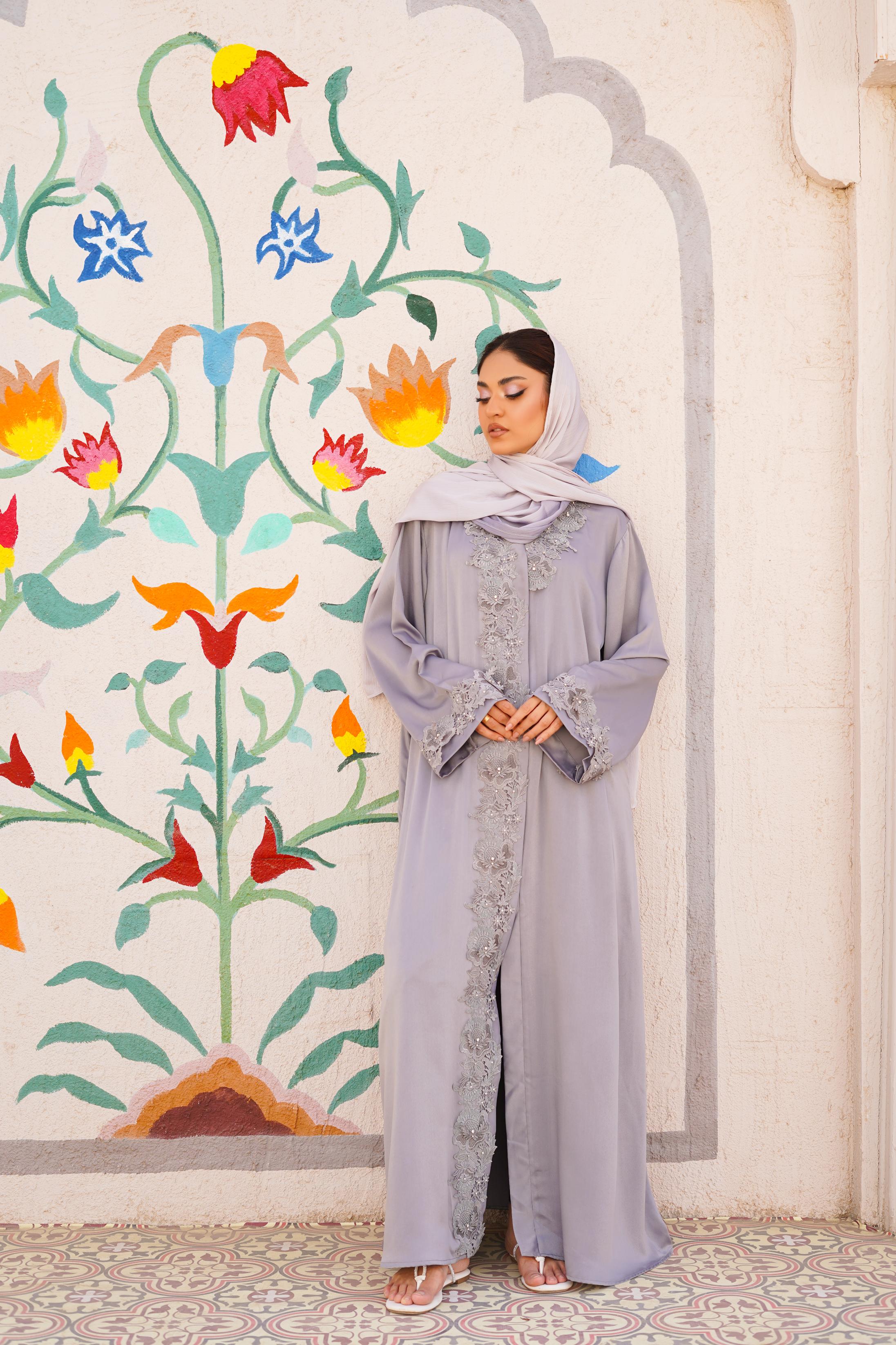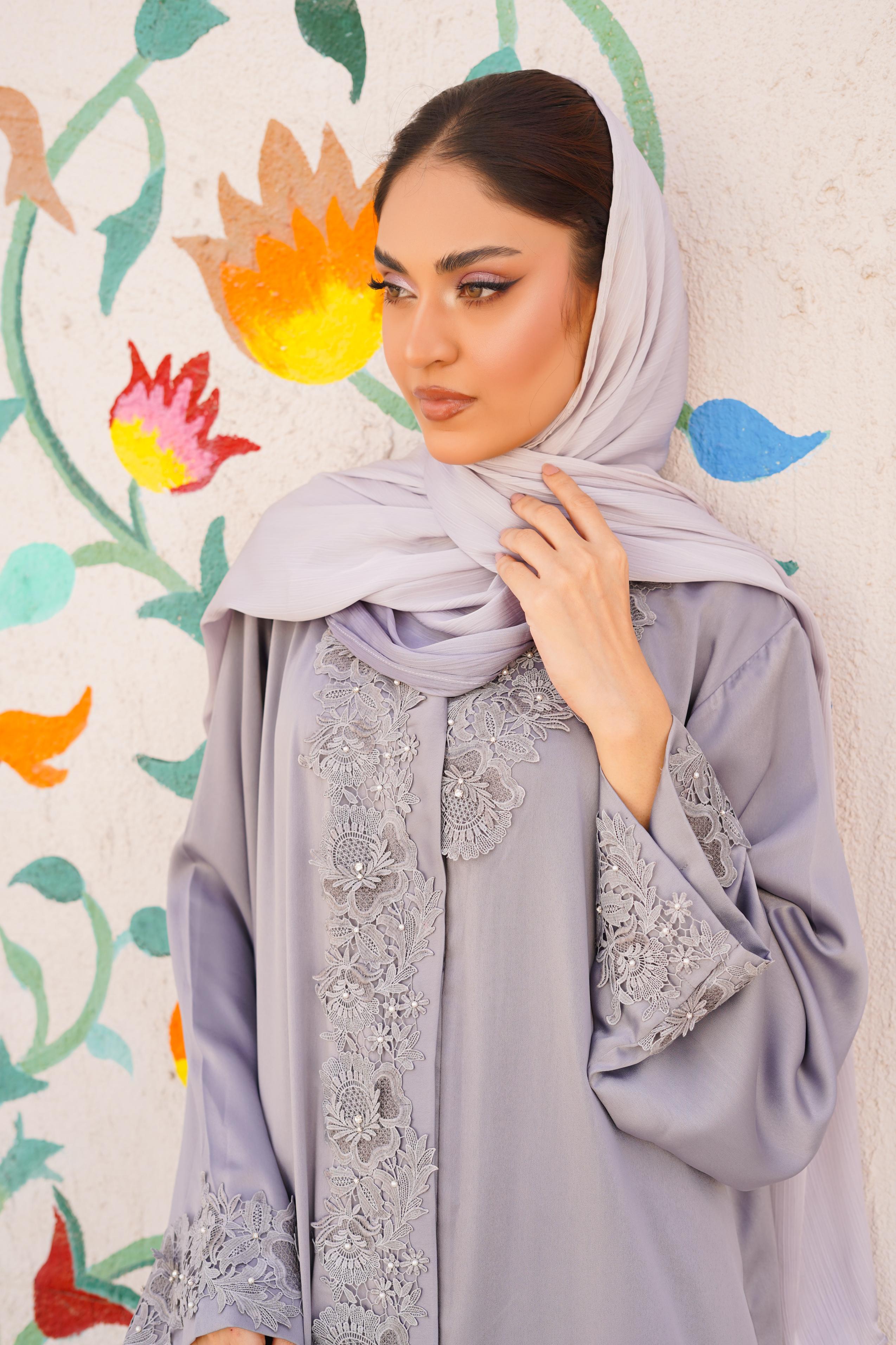 Details: Wrap yourself in luxury with this velvet silk abaya in a graceful grey hue. Adorned with delicate lace and intricate handwork detailing, this piece exudes timeless sophistication. Paired with a light grey contrasting scarf, it’s the perfect blend of elegance and comfort for any occasion.