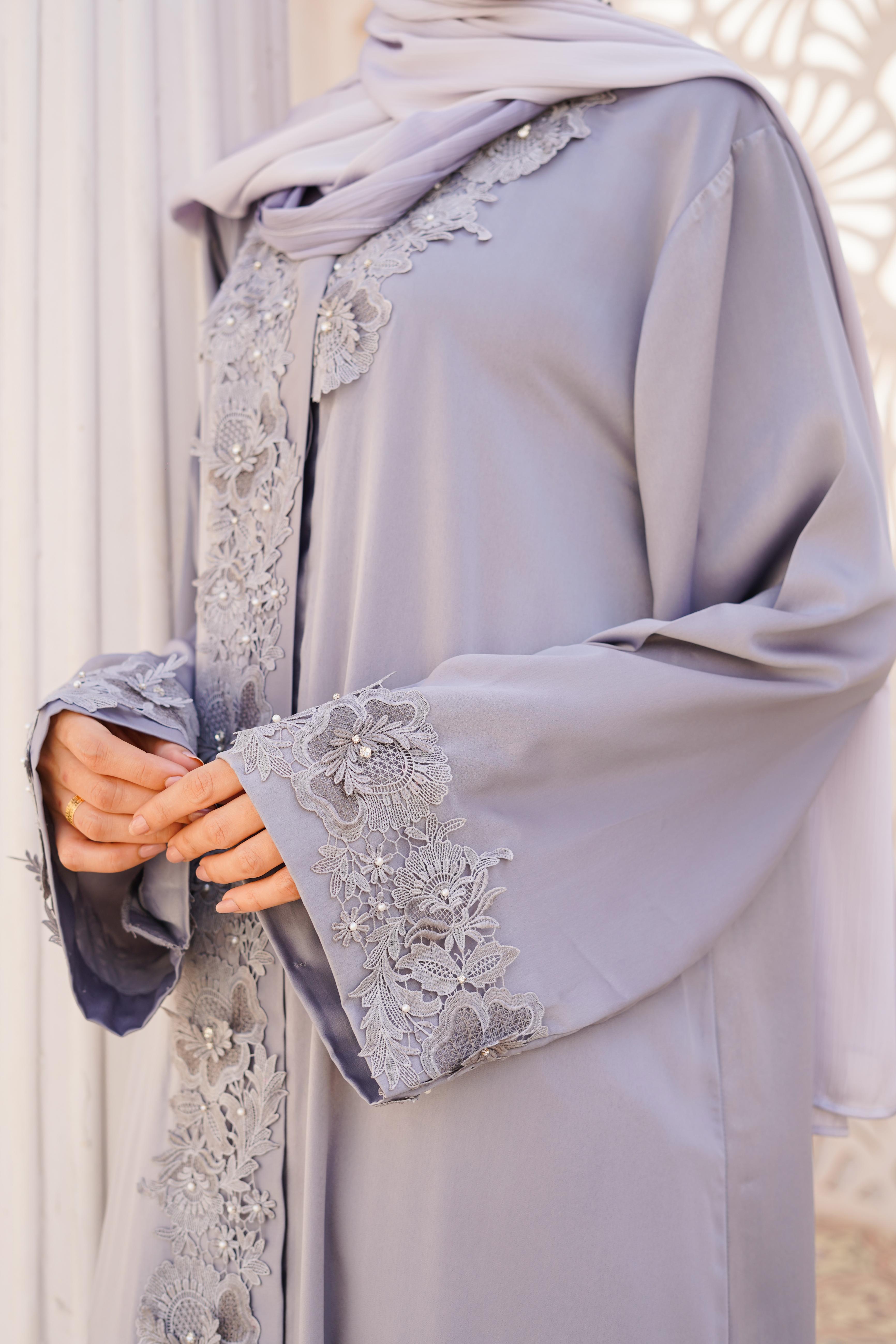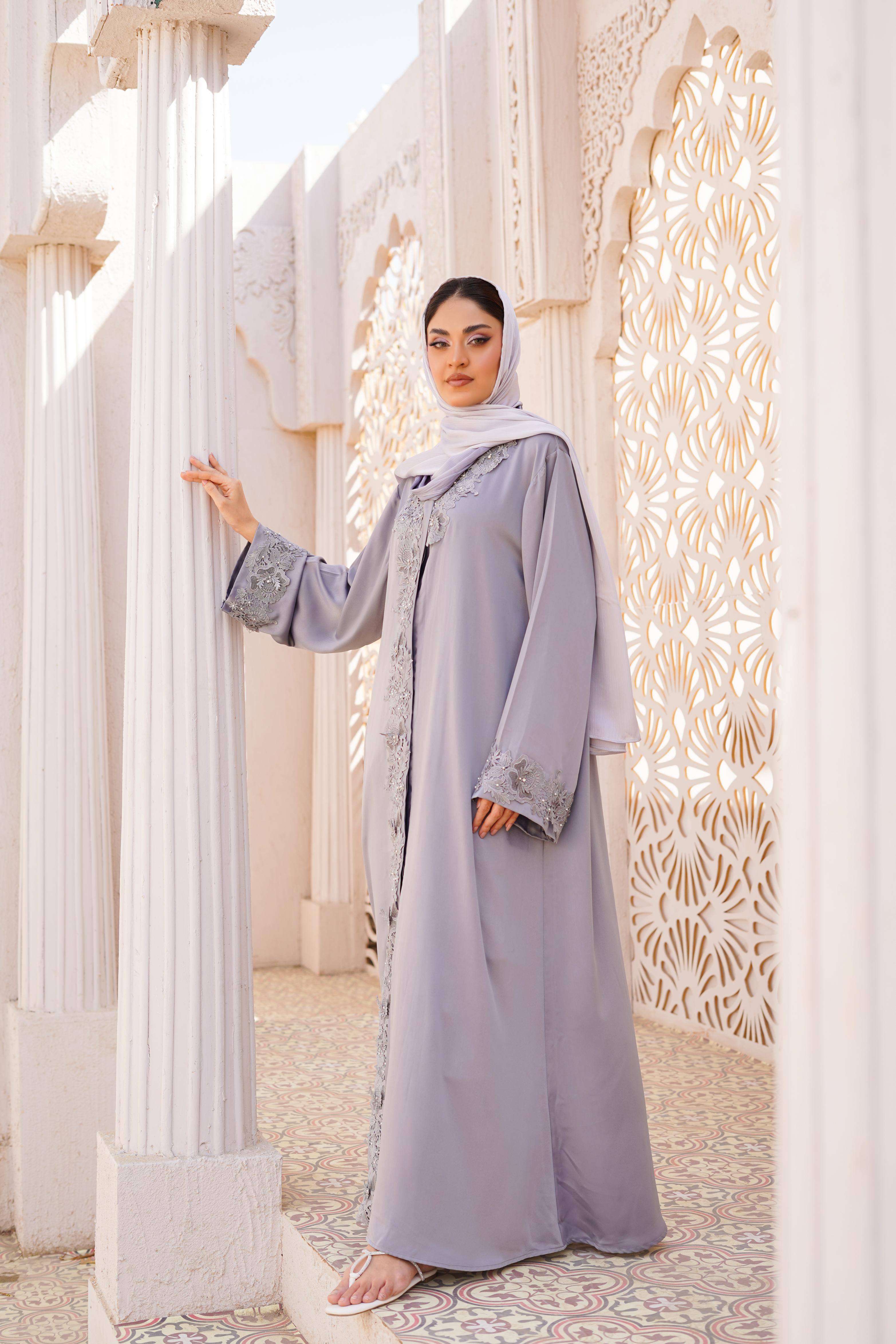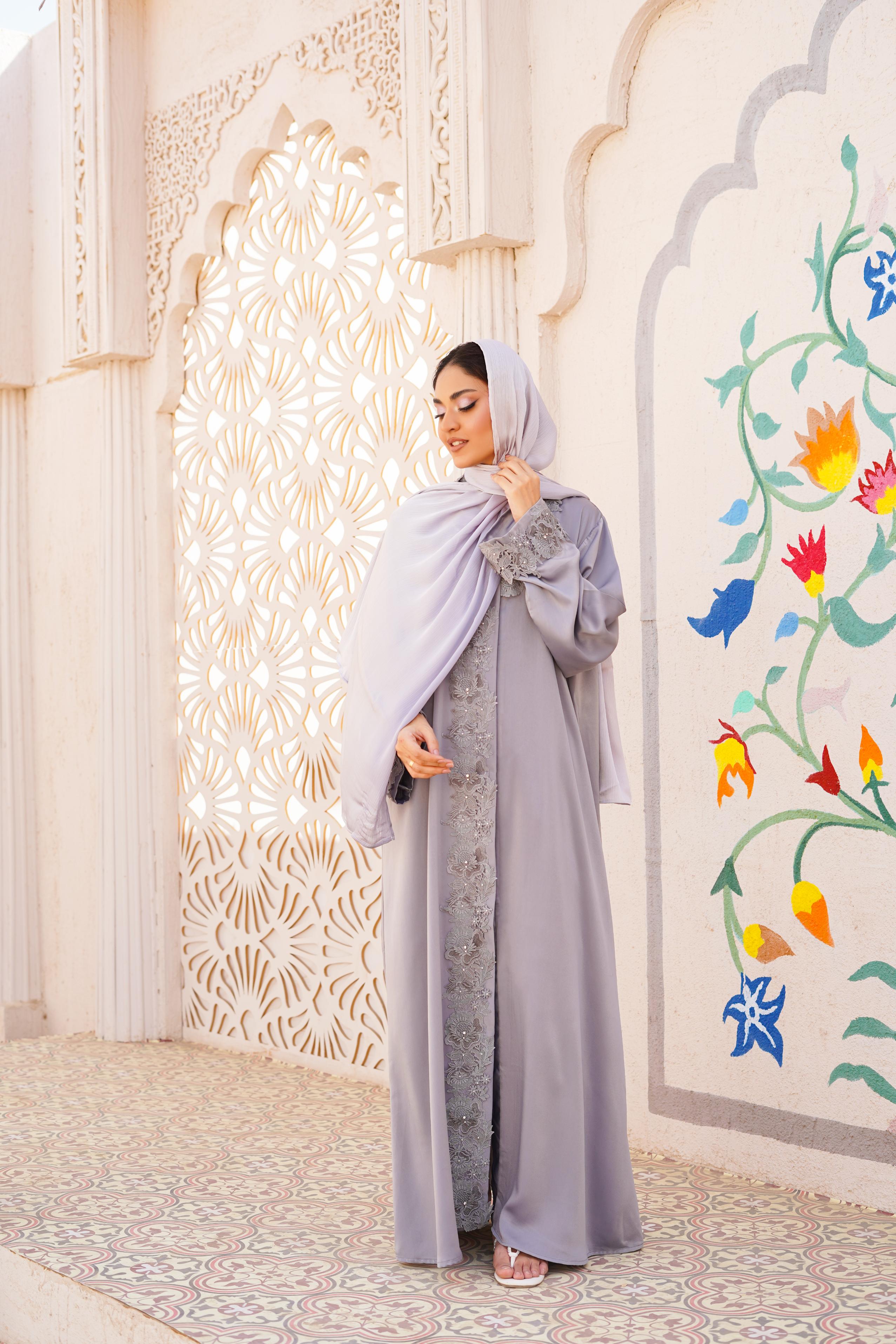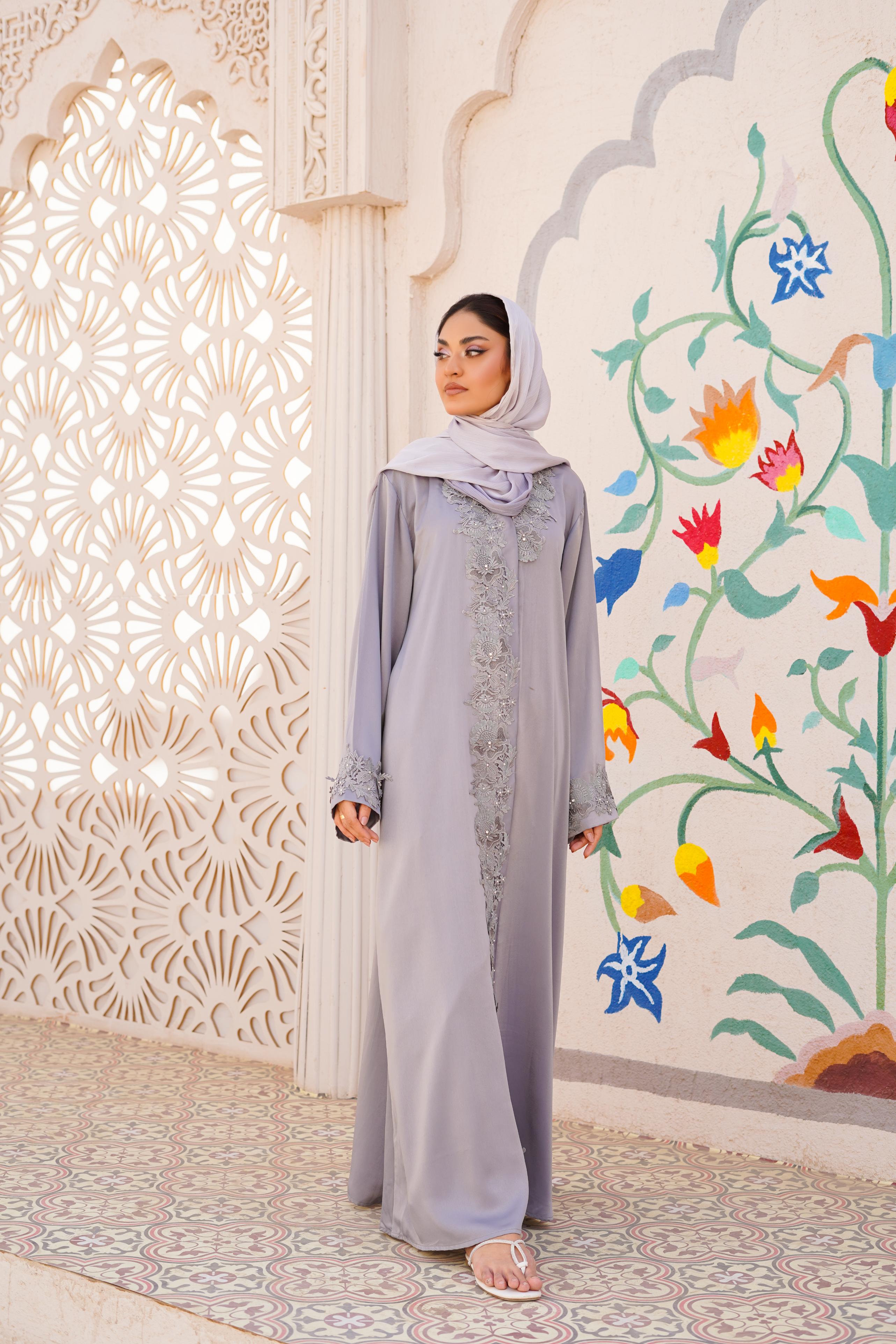Details: Wrap yourself in luxury with this velvet silk abaya in a graceful grey hue. Adorned with delicate lace and intricate handwork detailing, this piece exudes timeless sophistication. Paired with a light grey contrasting scarf, it’s the perfect blend of elegance and comfort for any occasion.