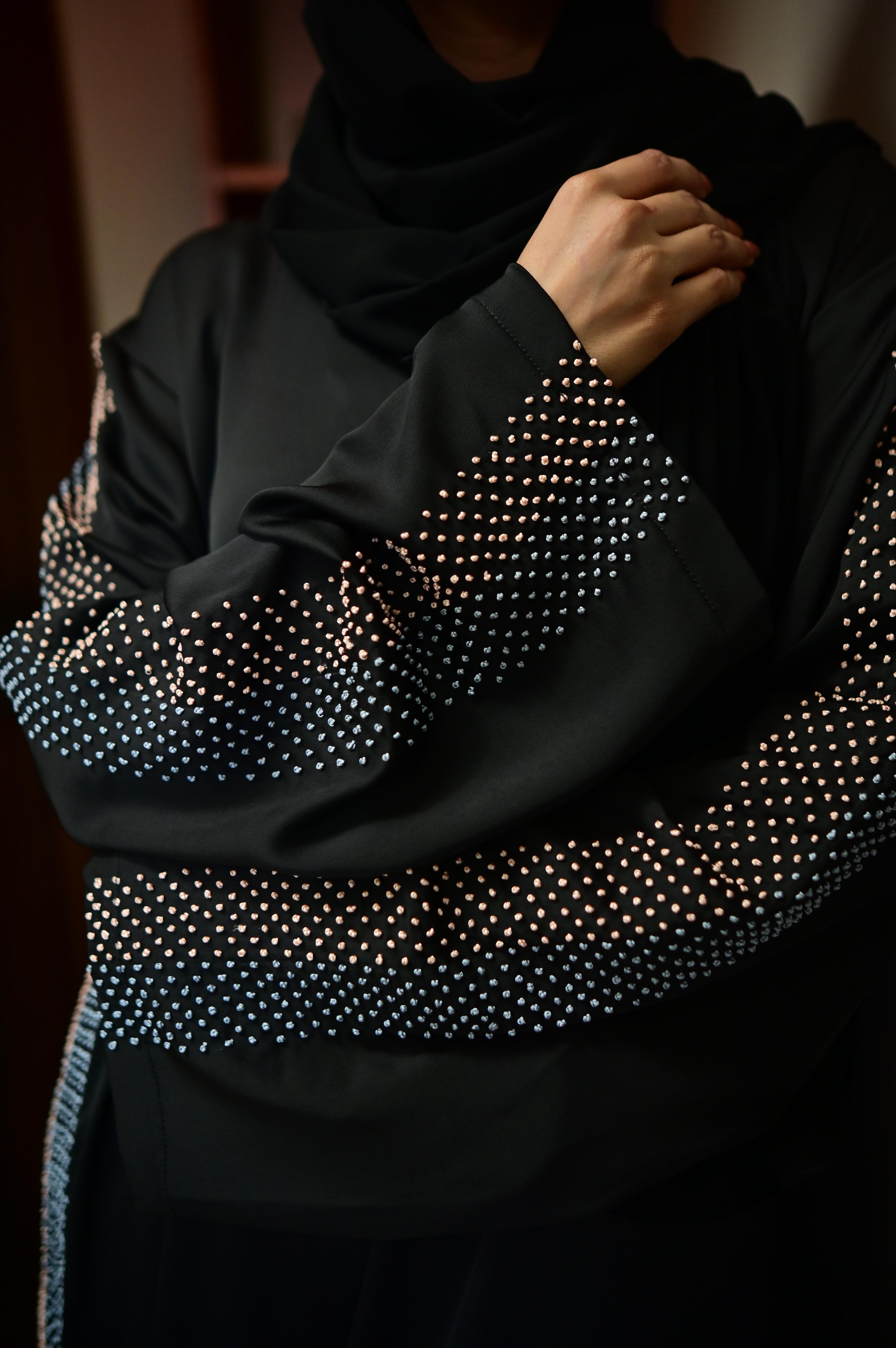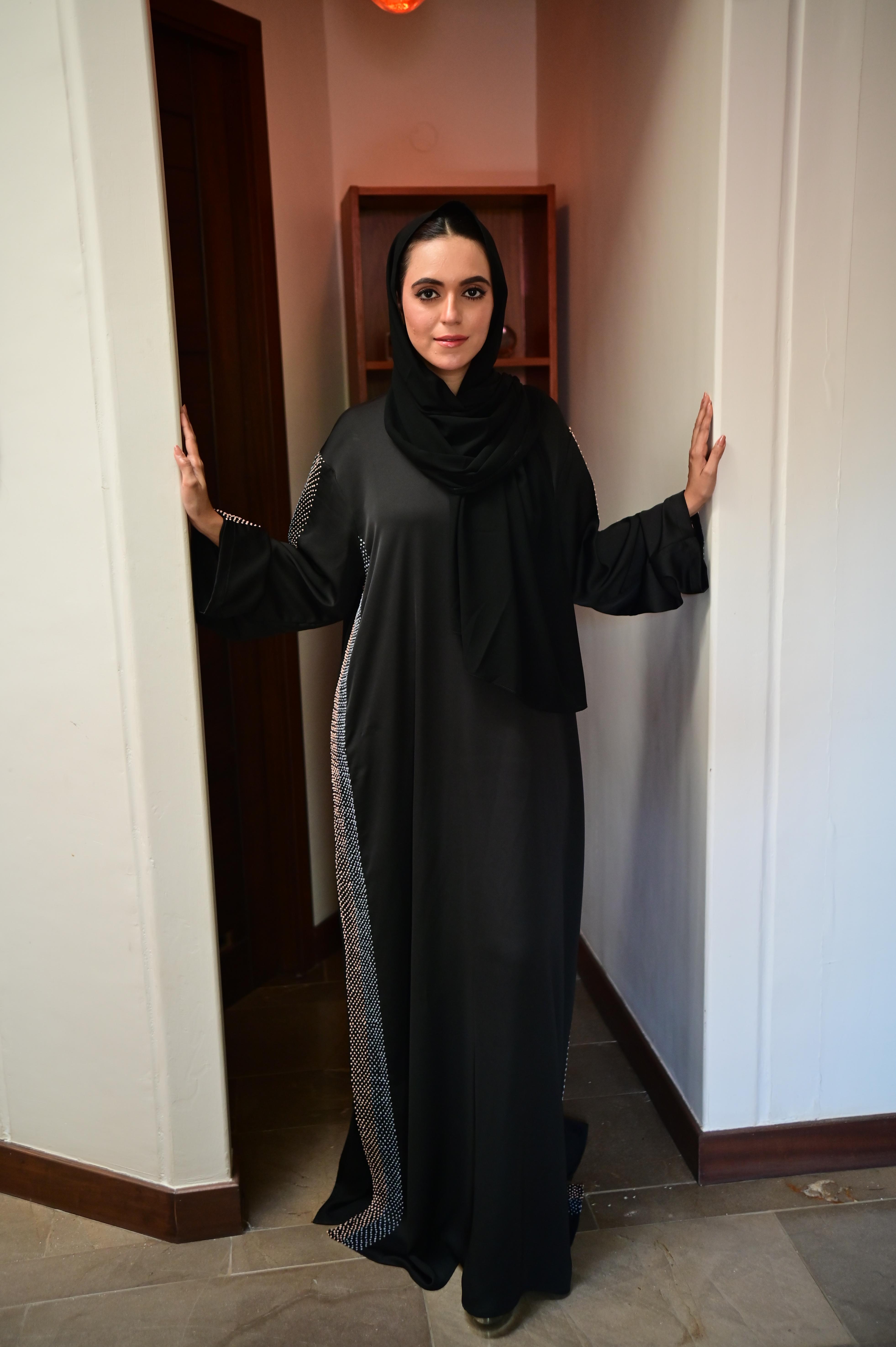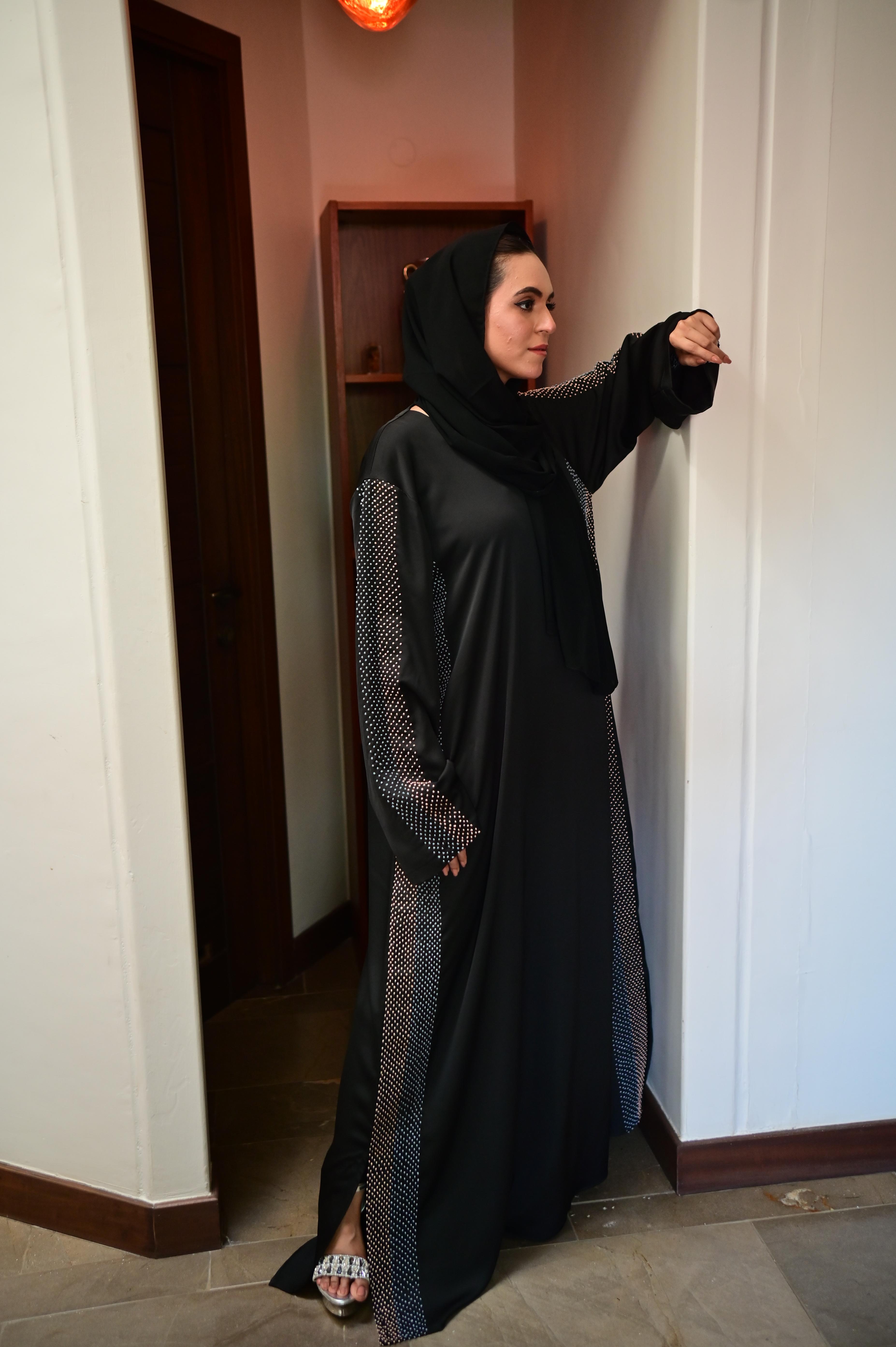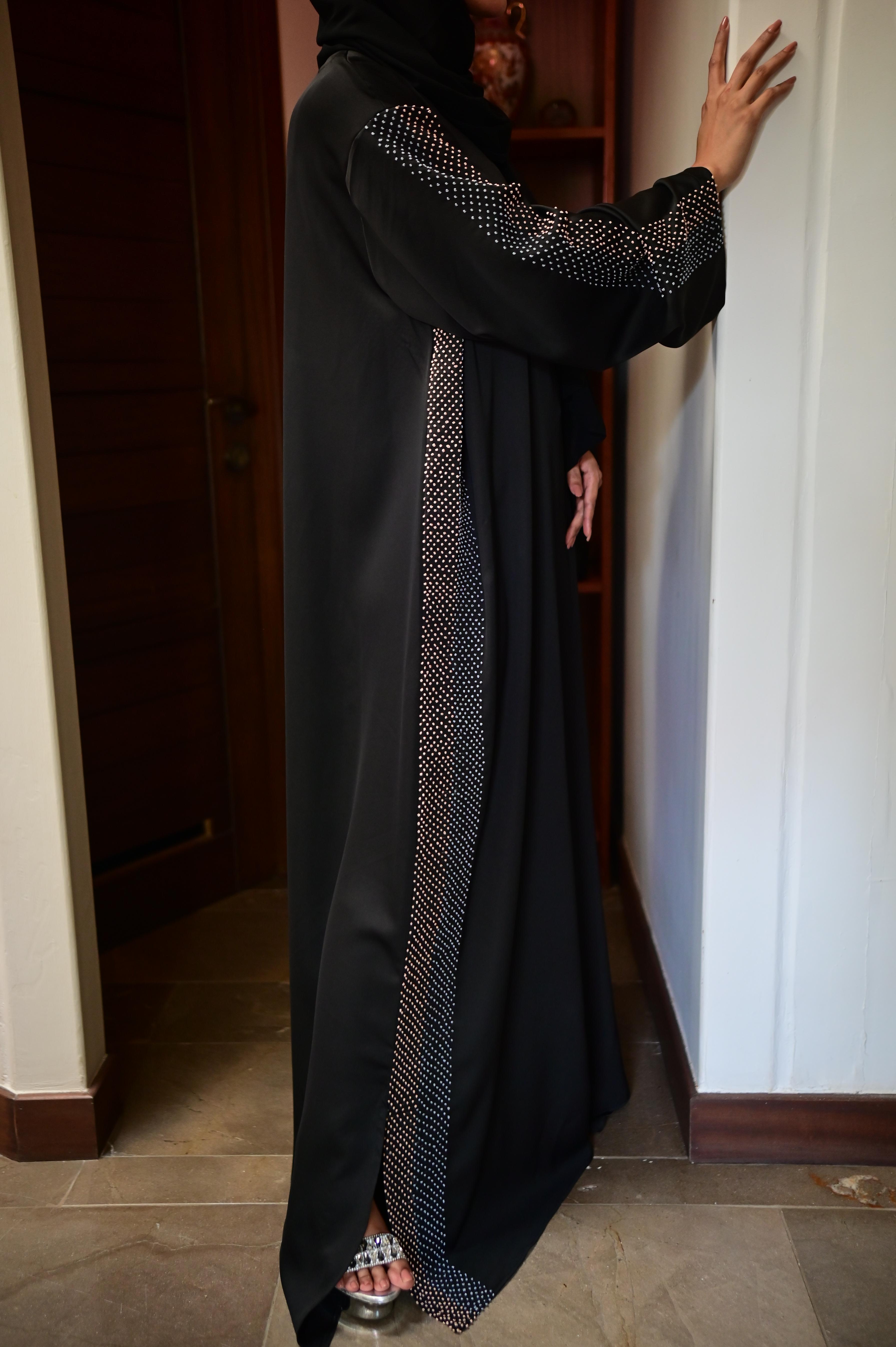 Details: Elevate your modest wardrobe with this stunning black abaya crafted from premium Nida fabric. Featuring intricate handwork that adds a touch of artisanal charm, the design is further enhanced with side panel detailing on both sides and the sleeves. Perfect for formal occasions or daily elegance.