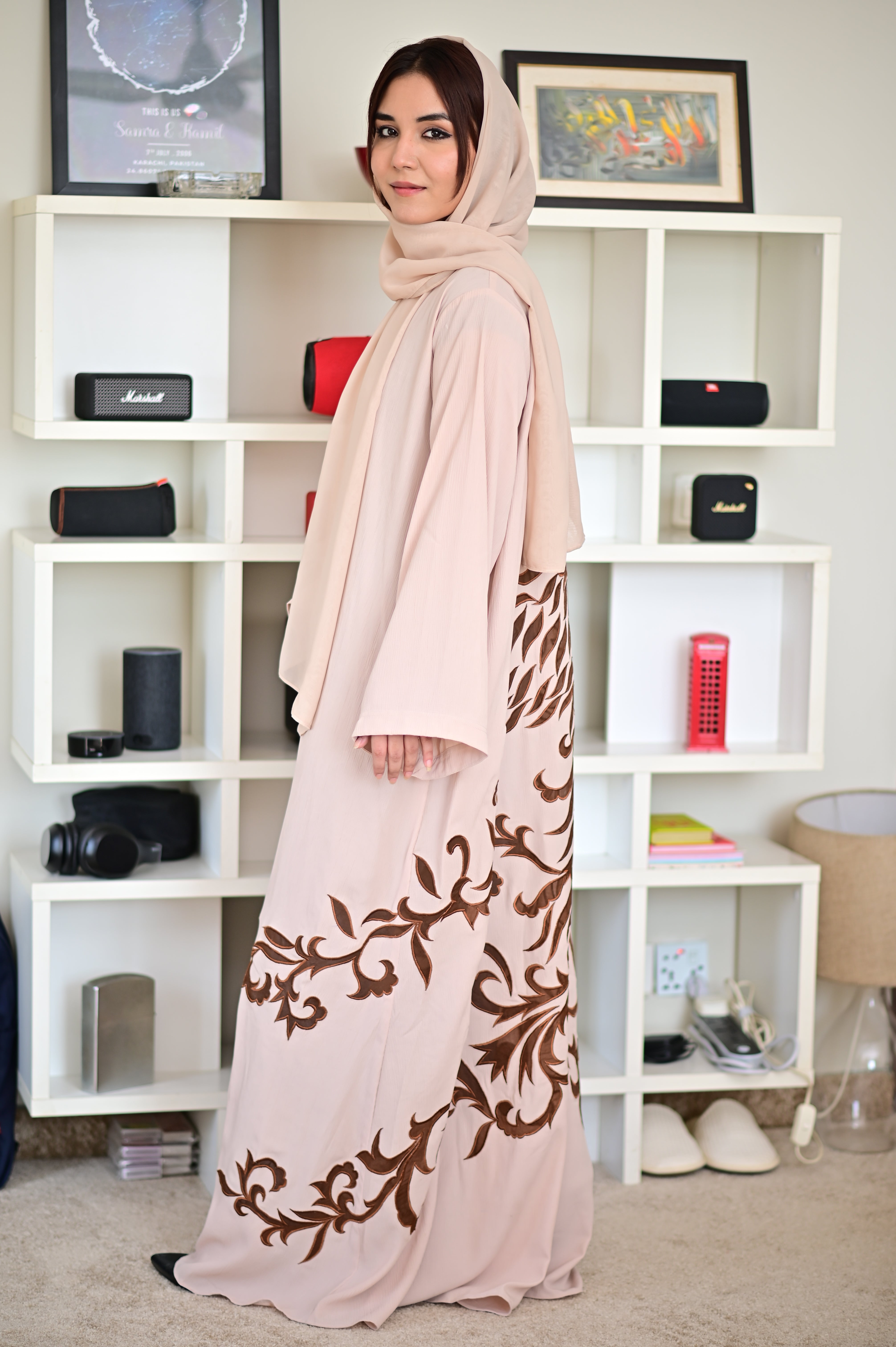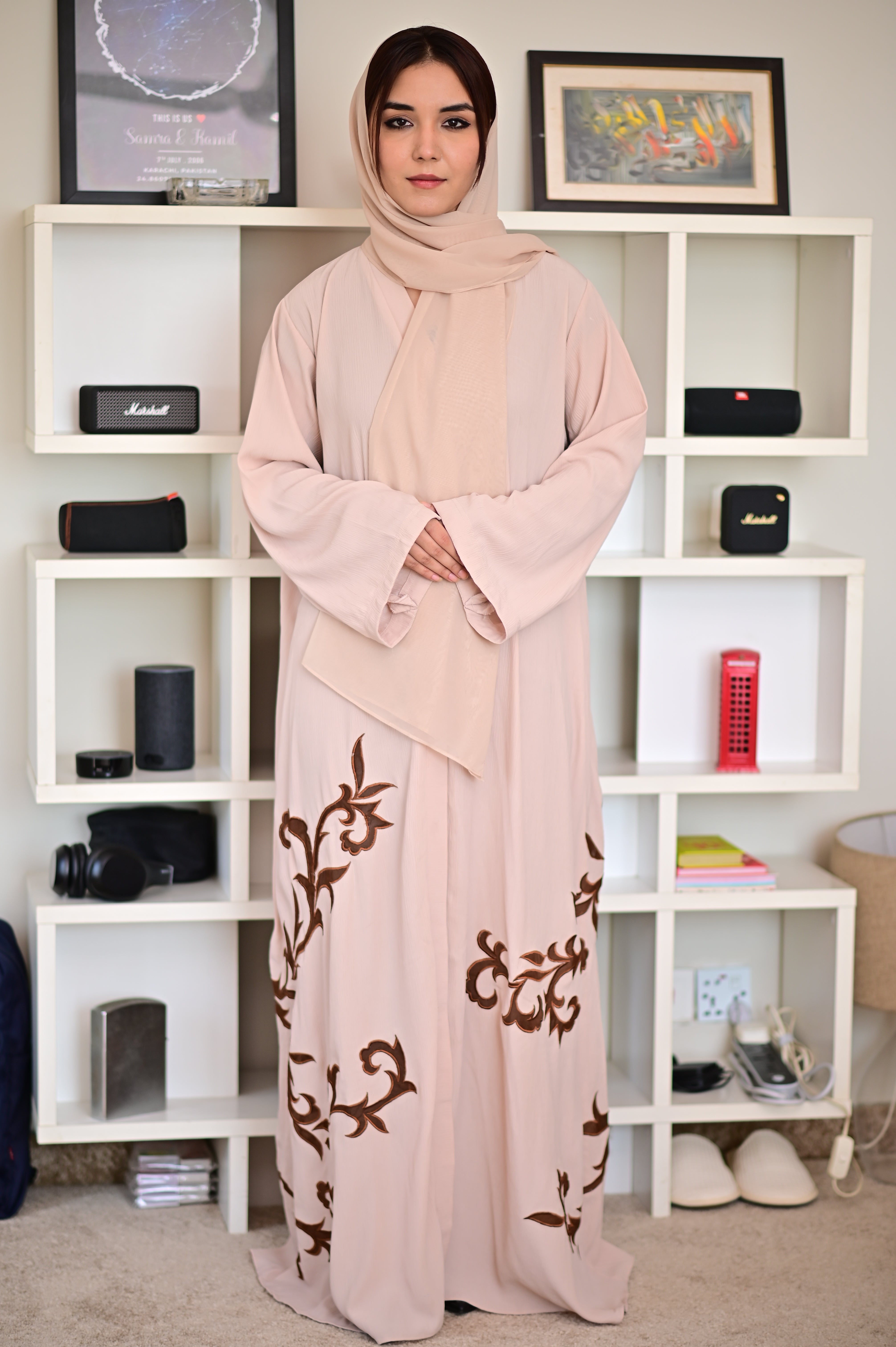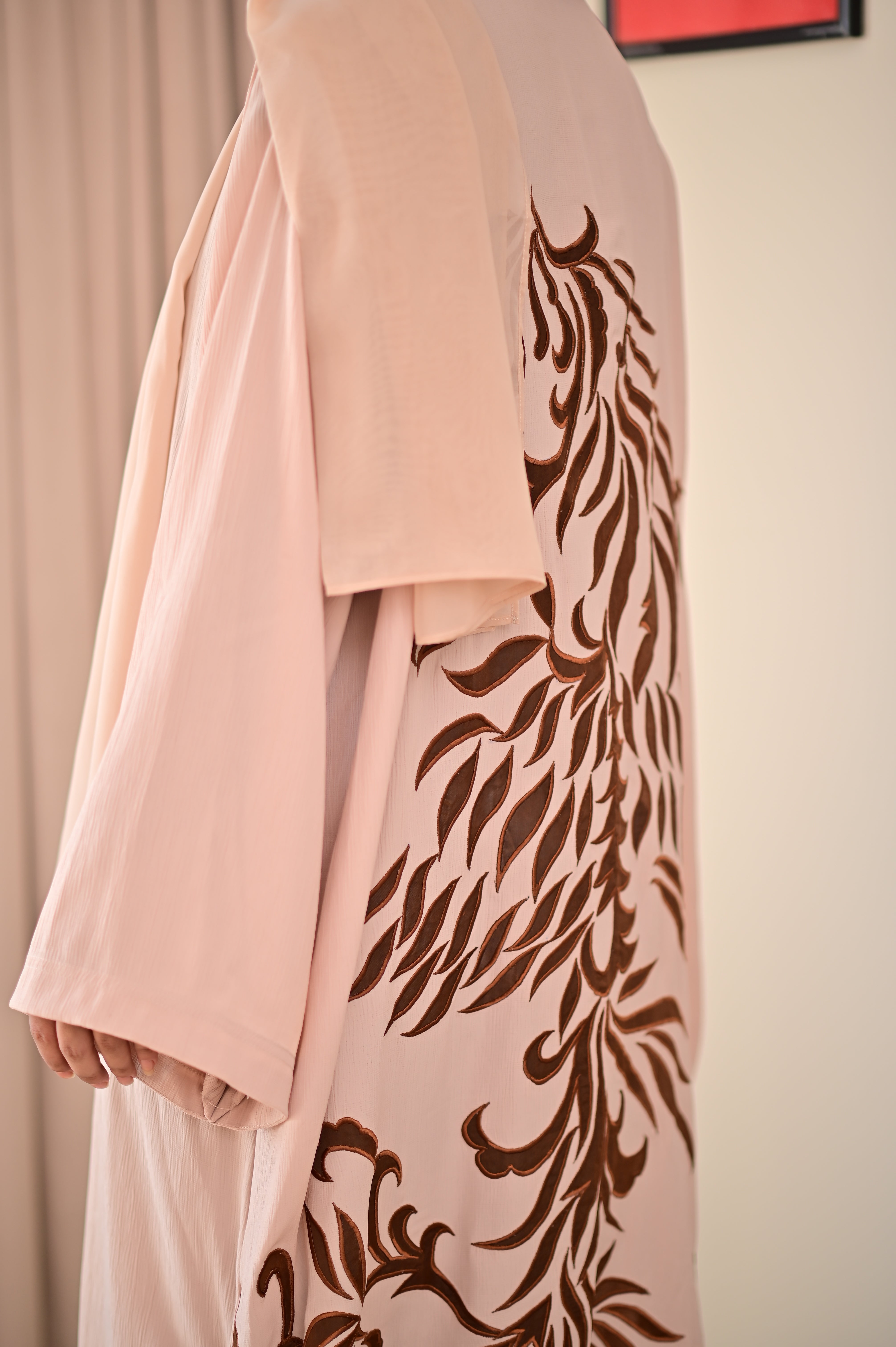 Details: A sophisticated pink-hued attire designed for formal elegance. The front of this abaya is adorned with intricate brown detailing, adding a touch of refinement. The harmonious blend of pink and brown creates a timeless and versatile piece, perfect for making a statement at formal occasions.