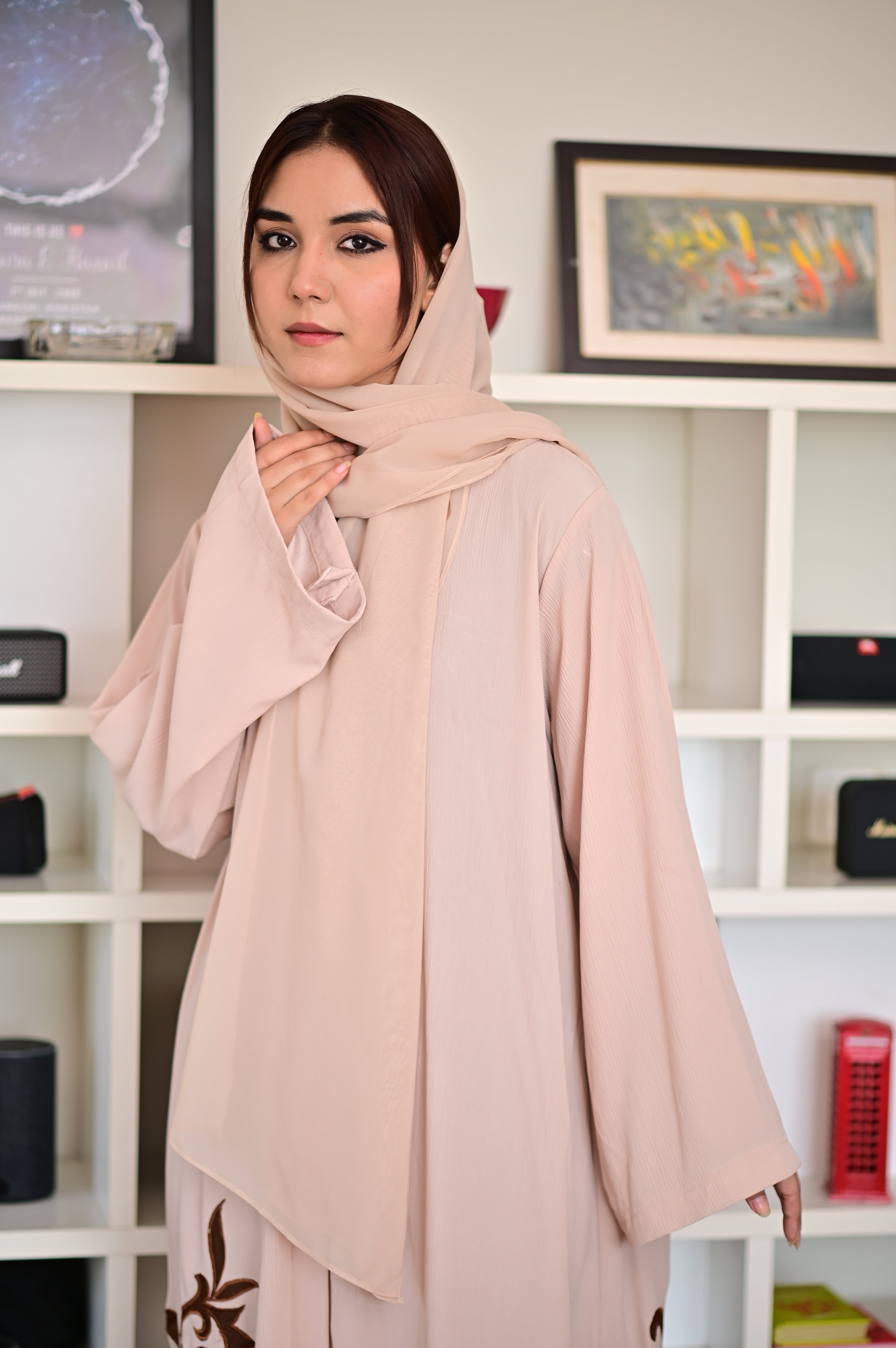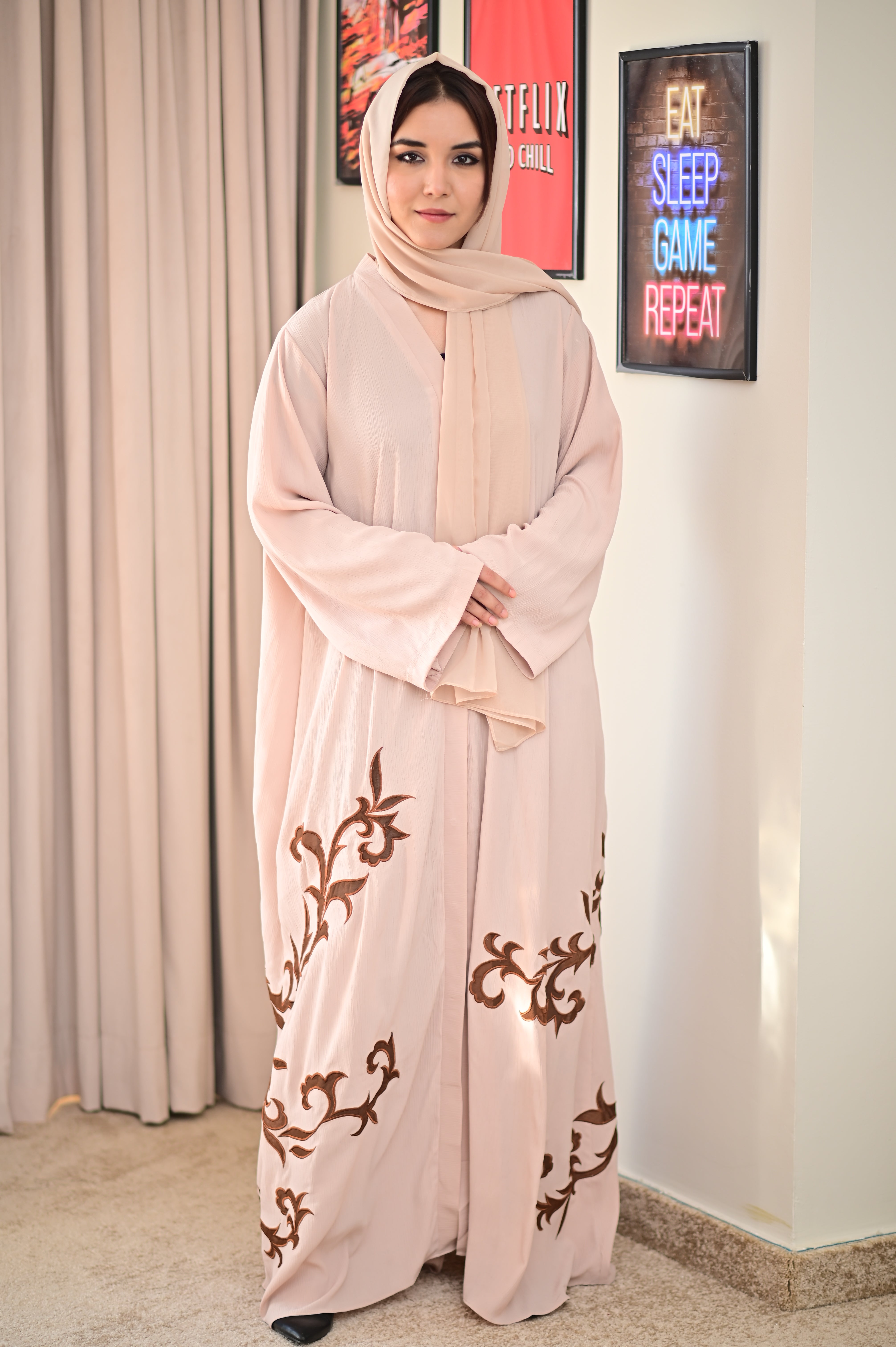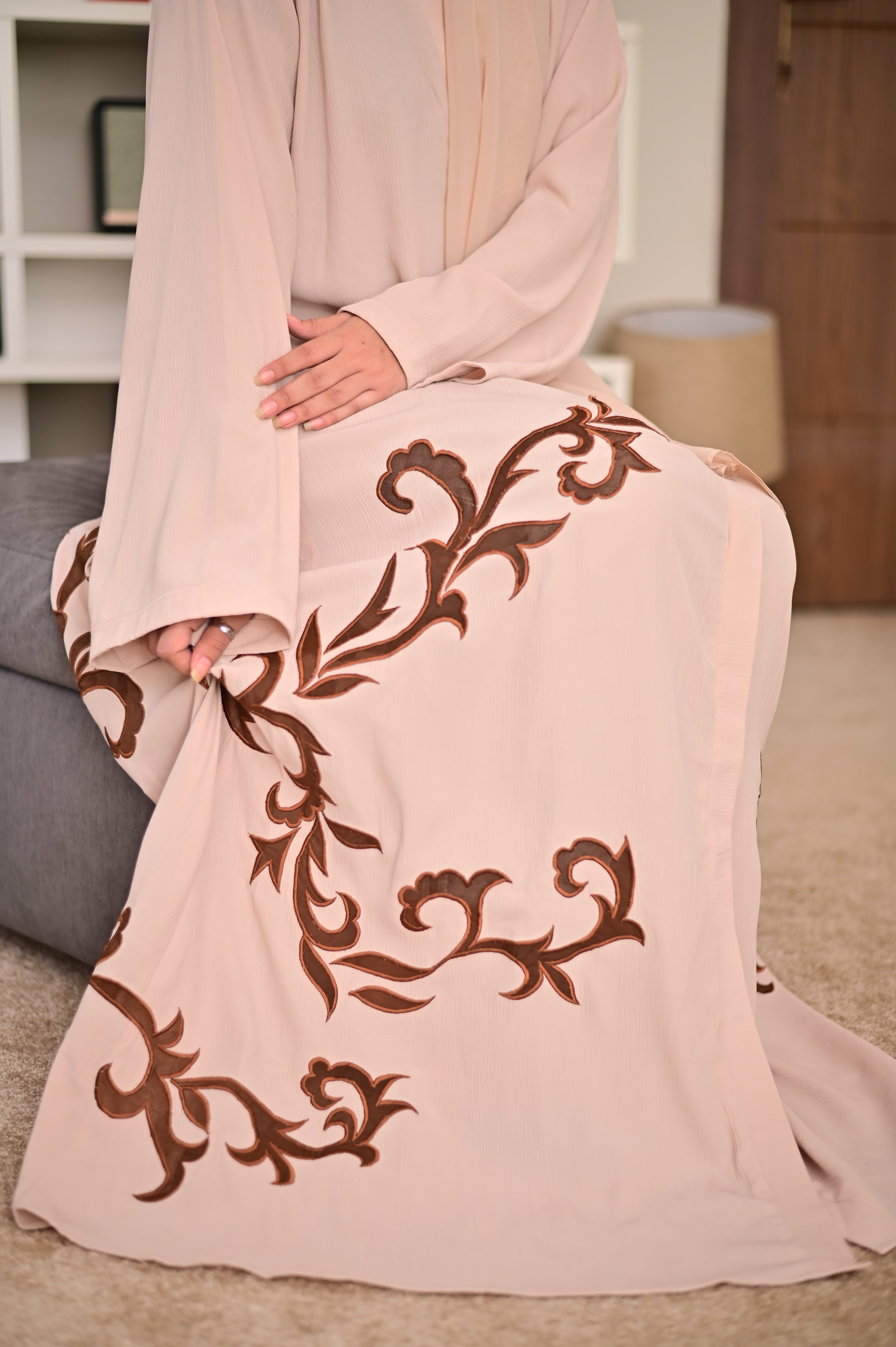 Details: A sophisticated pink-hued attire designed for formal elegance. The front of this abaya is adorned with intricate brown detailing, adding a touch of refinement. The harmonious blend of pink and brown creates a timeless and versatile piece, perfect for making a statement at formal occasions.