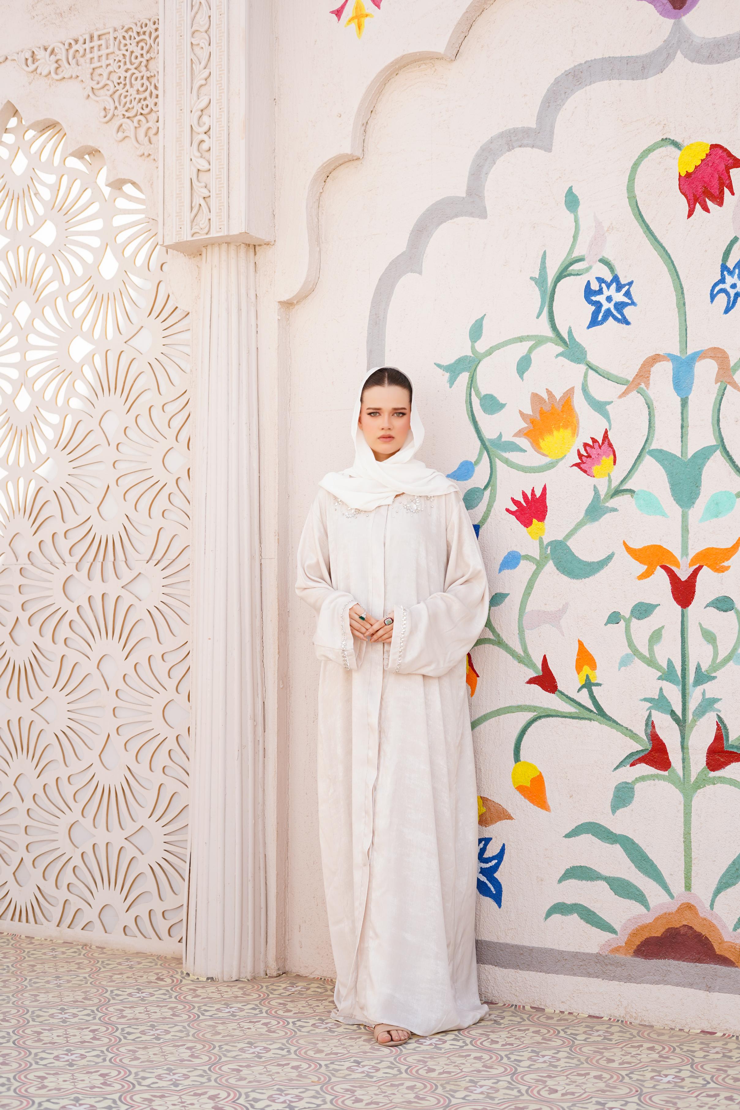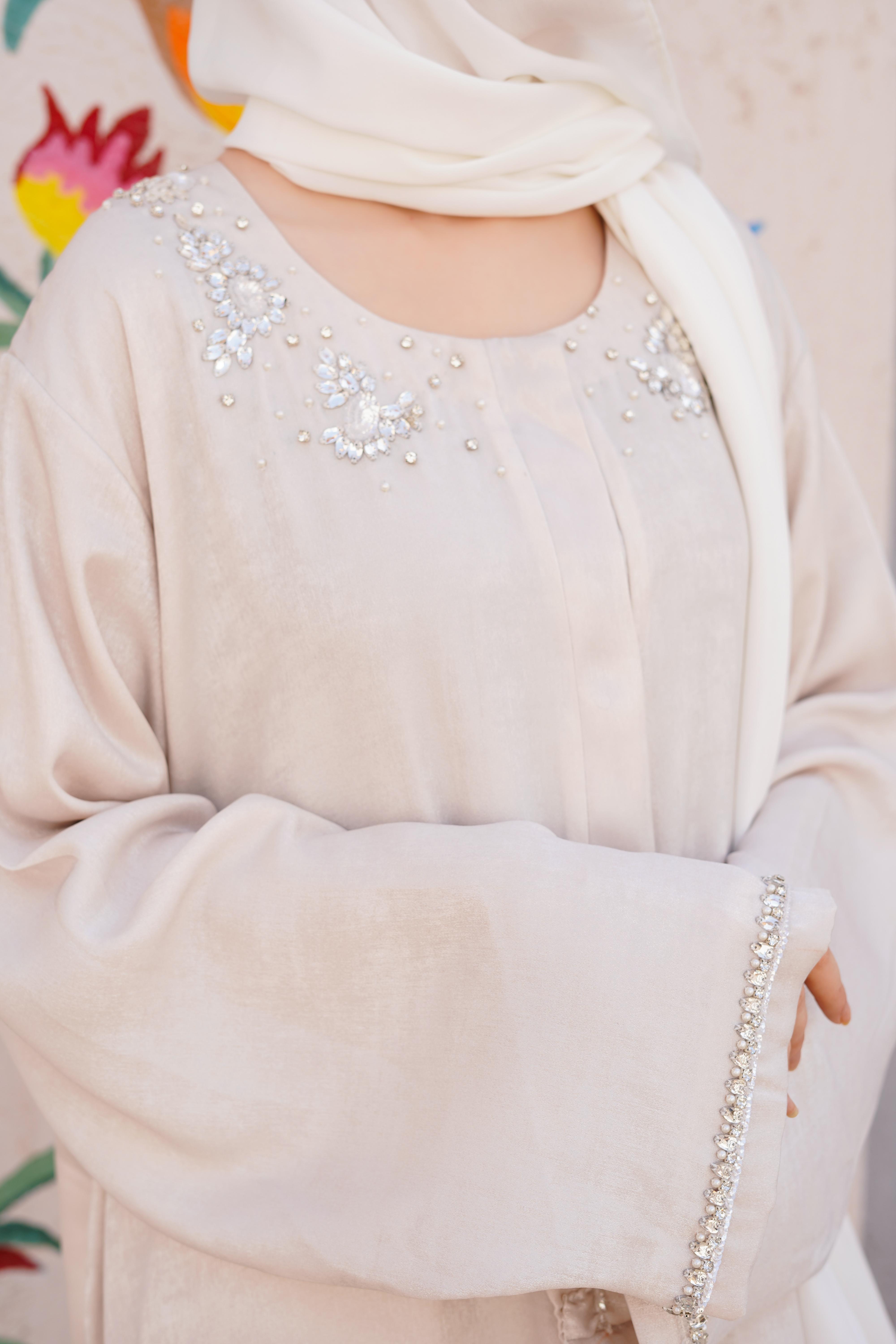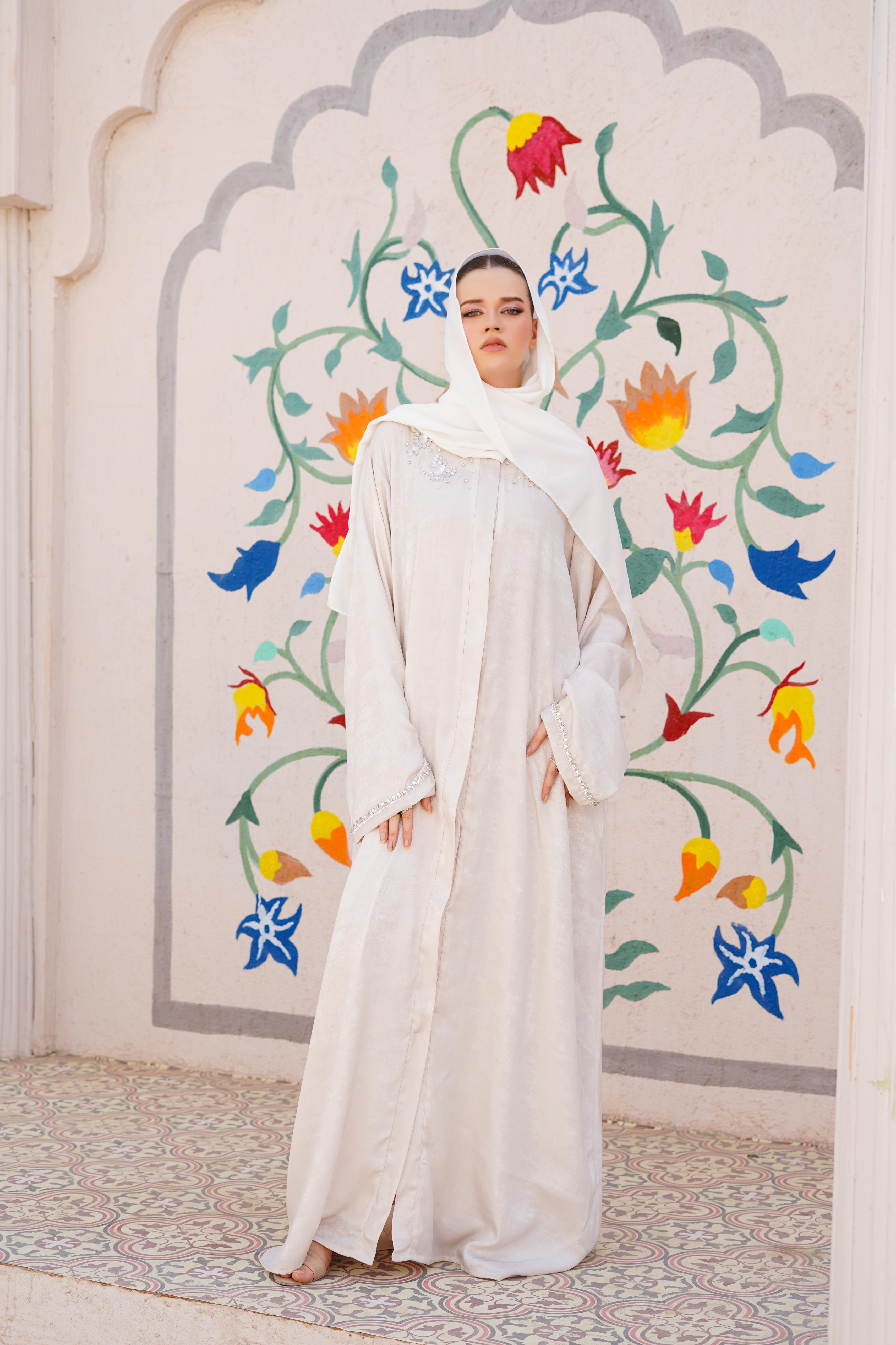 Details: Embrace timeless elegance with this stunning White Shimmer Abaya, designed for those who appreciate grace and sophistication. The delicate handwork detailing on the neckline adds a touch of luxury, while the flowing shimmer fabric creates an ethereal look. Complete with a matching scarf, this abaya is perfect for special occasions or elevating your everyday style
