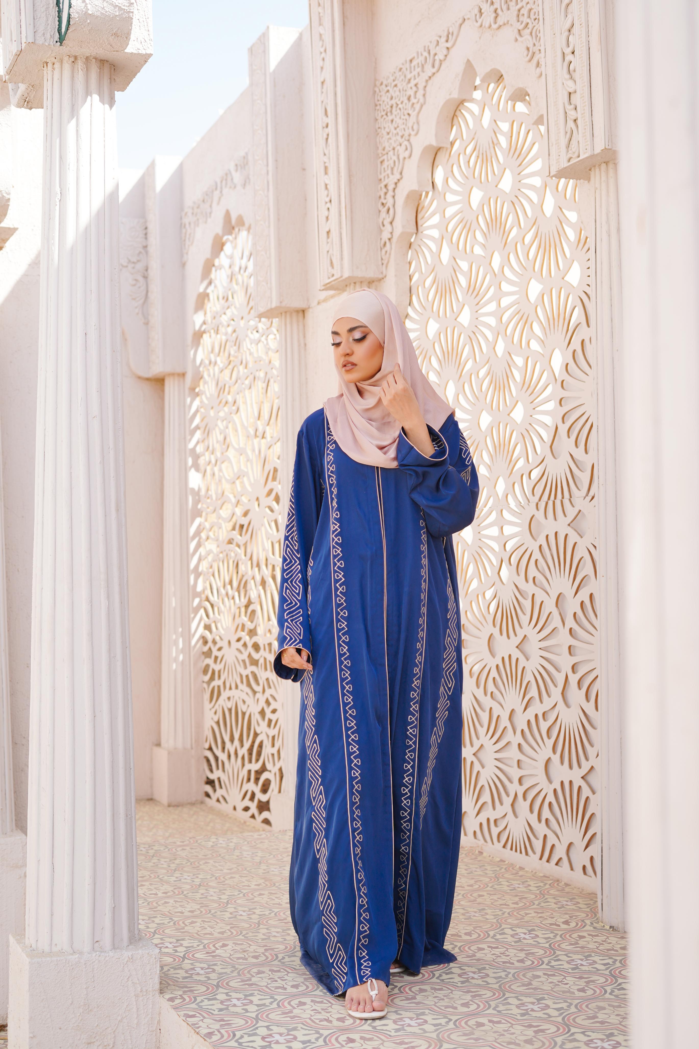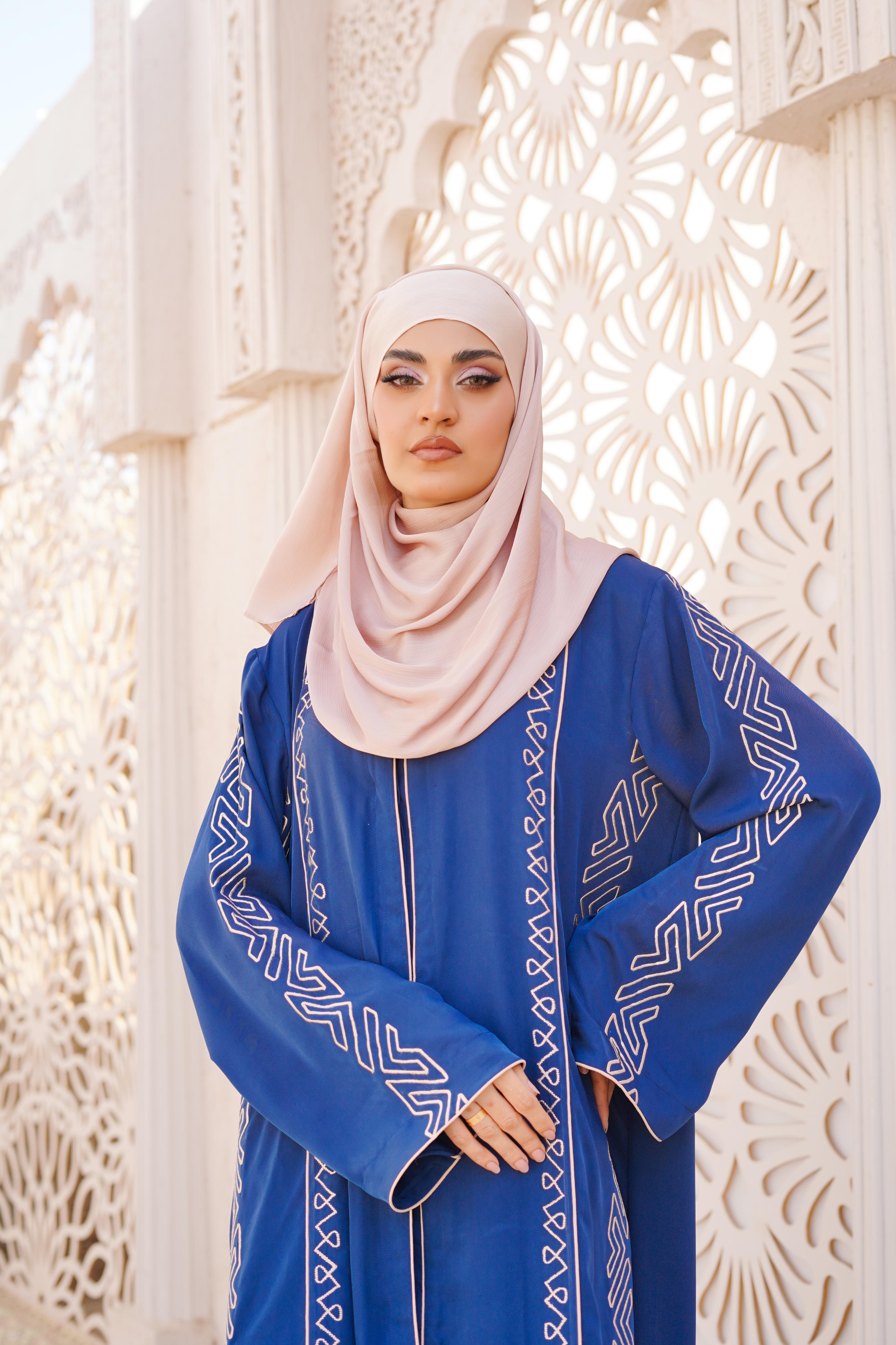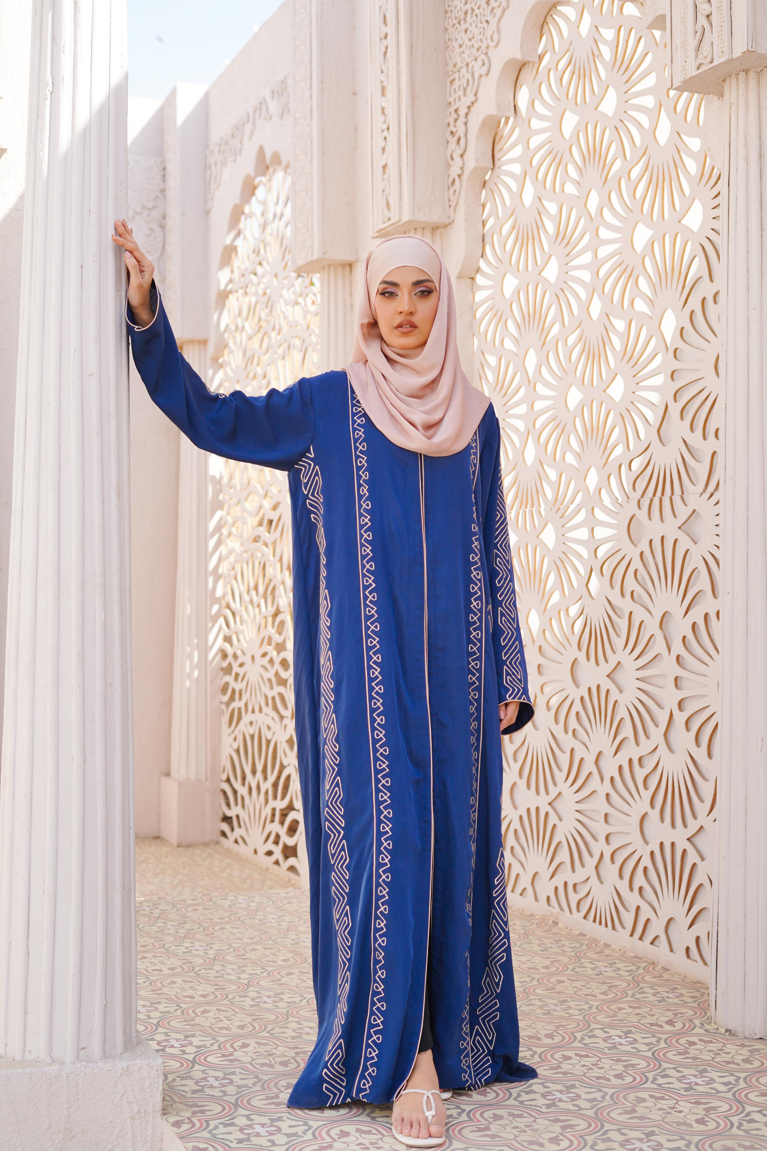 Details: Step into sophistication with this royal blue abaya, adorned with intricate machine embroidery that adds a touch of grace. Designed for modern elegance, its flowing silhouette and delicate detailing create a regal yet effortless look. Perfect for special occasions or everyday refinement with a contrasting Scarf.