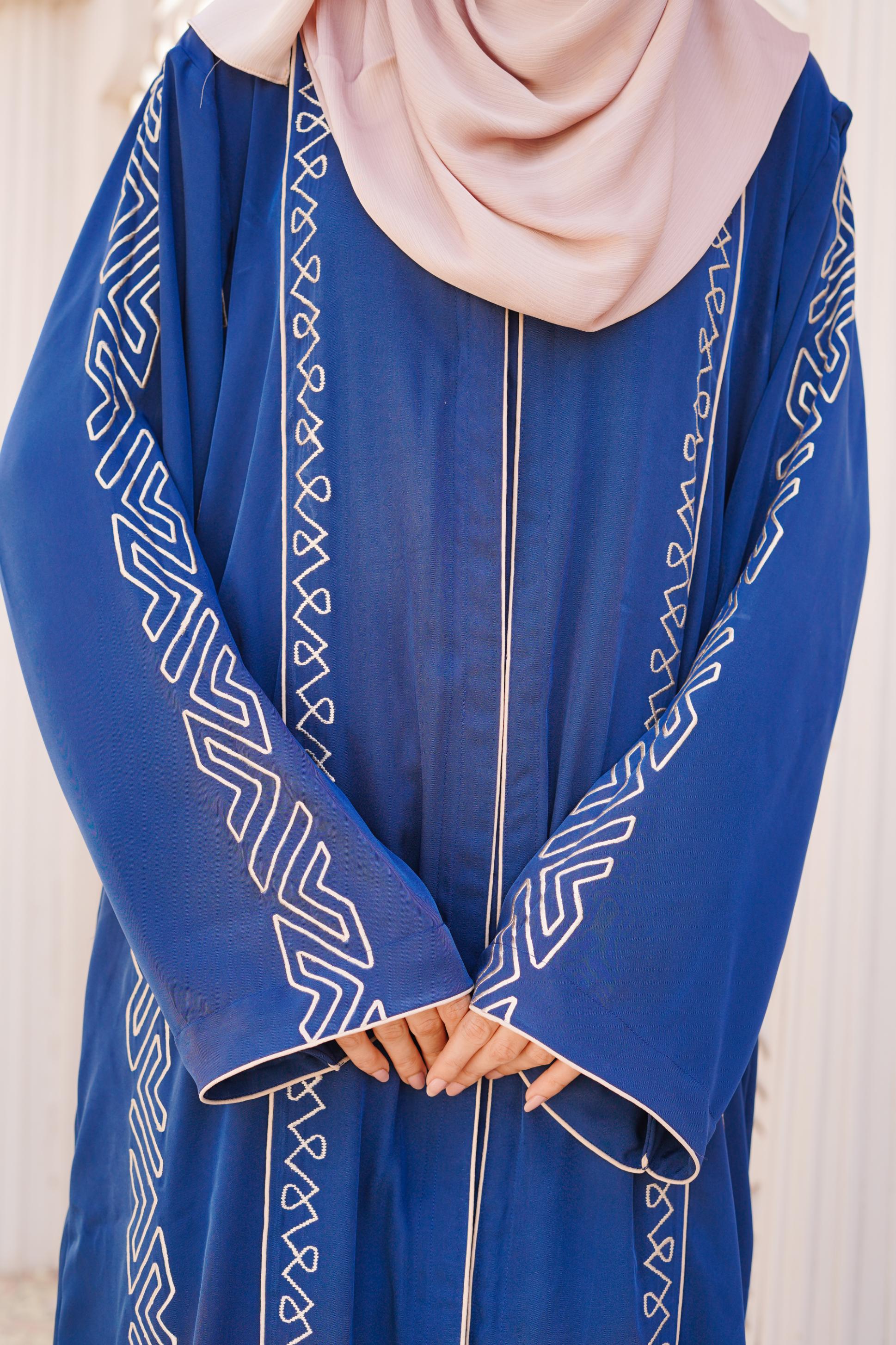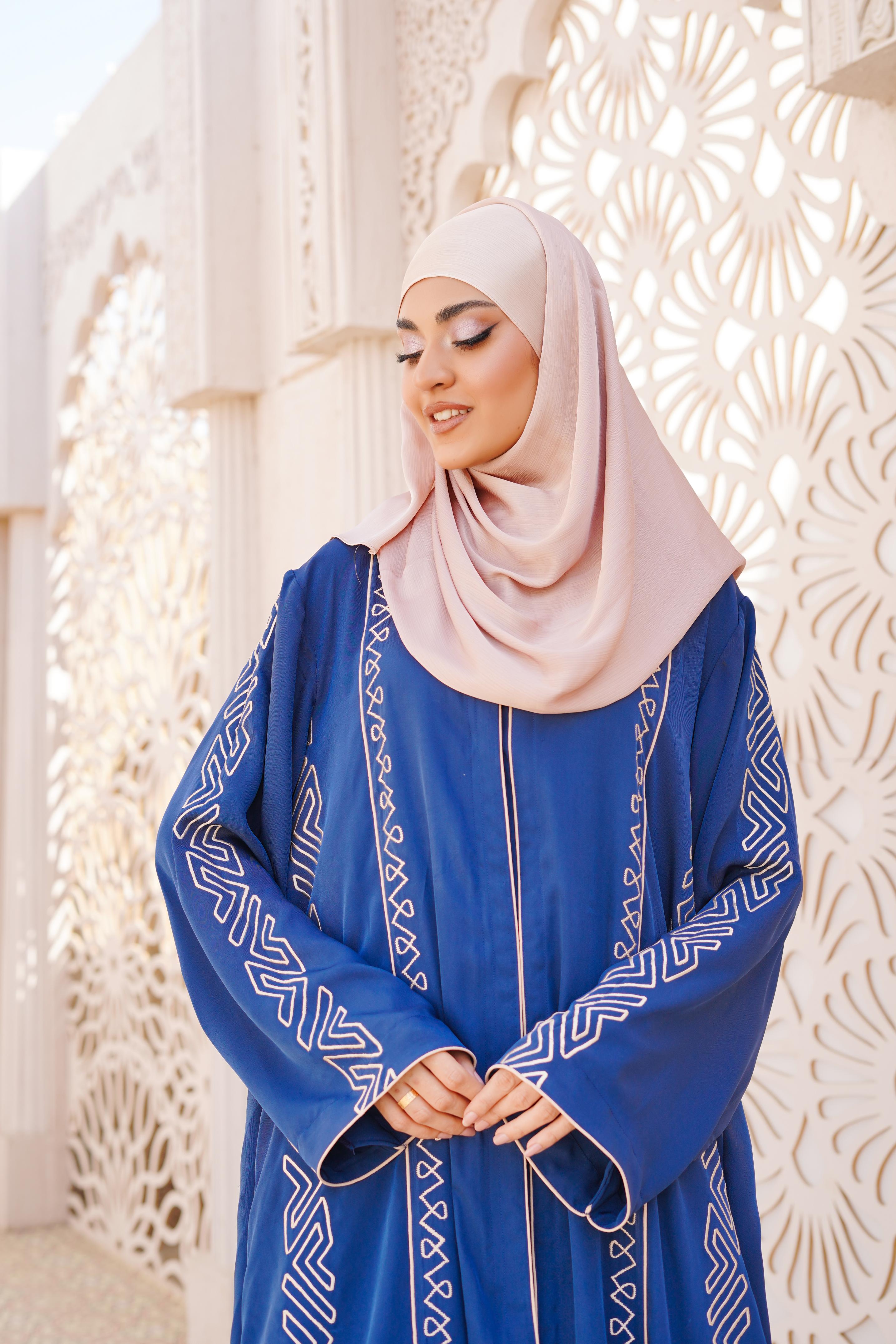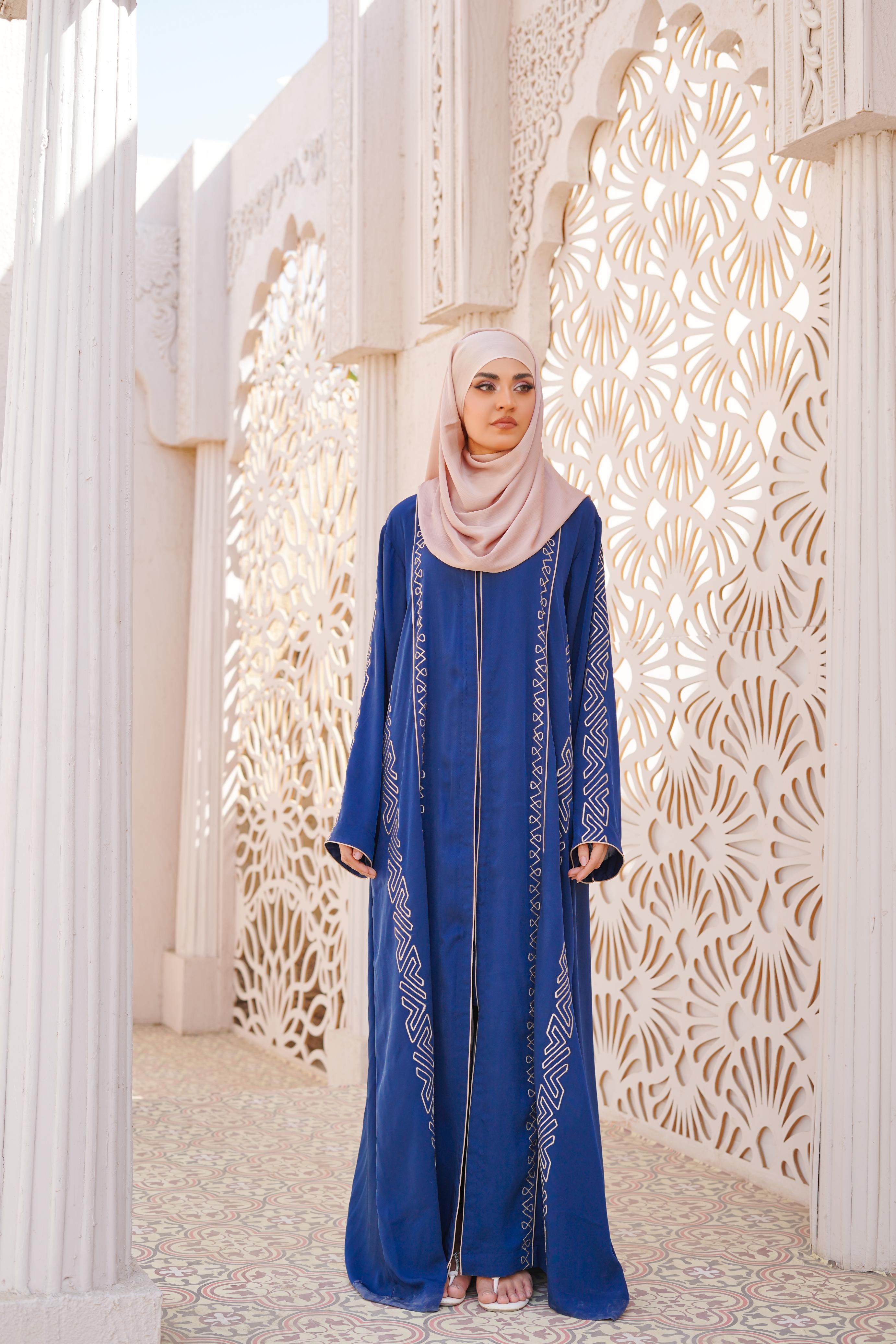Details: Step into sophistication with this royal blue abaya, adorned with intricate machine embroidery that adds a touch of grace. Designed for modern elegance, its flowing silhouette and delicate detailing create a regal yet effortless look. Perfect for special occasions or everyday refinement with a contrasting Scarf.